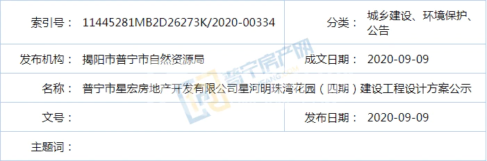 今天,普宁市自然资源局公示了普宁市星宏房地产开发有限公司星河明珠湾花园(四期)建设工程设计方案,具体内容如下: