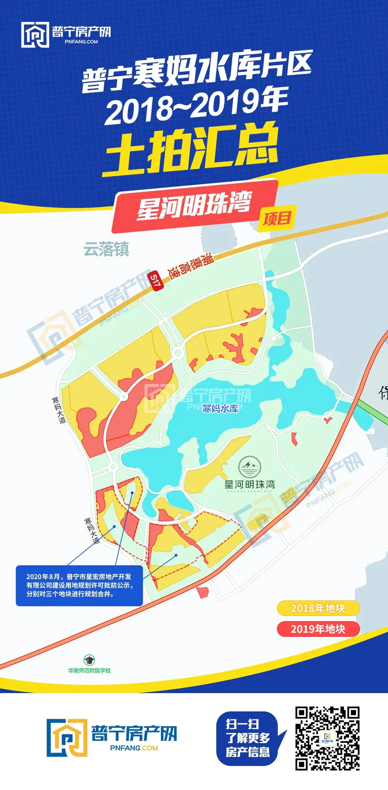2018-2019年星河地产土拍汇总 从2018-2019年土拍的合并图可以看出,位于寒妈水库北侧的地块已完整的拼合在一起,而位于寒妈水库南侧的地块还是零零散散无法拼凑。就在今年8月份,普宁市自然资源局发布了普宁市星宏房地产开发有限公司建设用地规划许可批前公示,分别对三个地块进行规划合并,至此寒妈水库南侧地块也完整拼合。 结语 普宁市寒妈水库是普宁市政府2017年批复的重点规划区域,总用地面积3.09平方公里,本着生态造景、文化塑魂、人居新城的发展理念,注入潮汕文化、青梅文化、寒妈传说、潮人精神,实现城市与景区、生态与文化、保护与开发的高度融合,致力打造集“教育、商业、文化、休闲、居住”于一体的具有潮汕特色的智慧小镇。 星河明珠湾鸟瞰图 据小房君了解,星河明珠湾四期的组团名叫君澜,寓意着尊贵的地位及享有的配套资源高度,作为重点打造的教育人文组团,有着邻商近学府的优势,优近享受星河明珠湾最好的华附学府和商业资源配套,是为普宁高端居住人群量身打造的全龄化教育居住区。 想了解更多楼市详情 欢迎添加小房君微信 或底部留言与小房君互动!