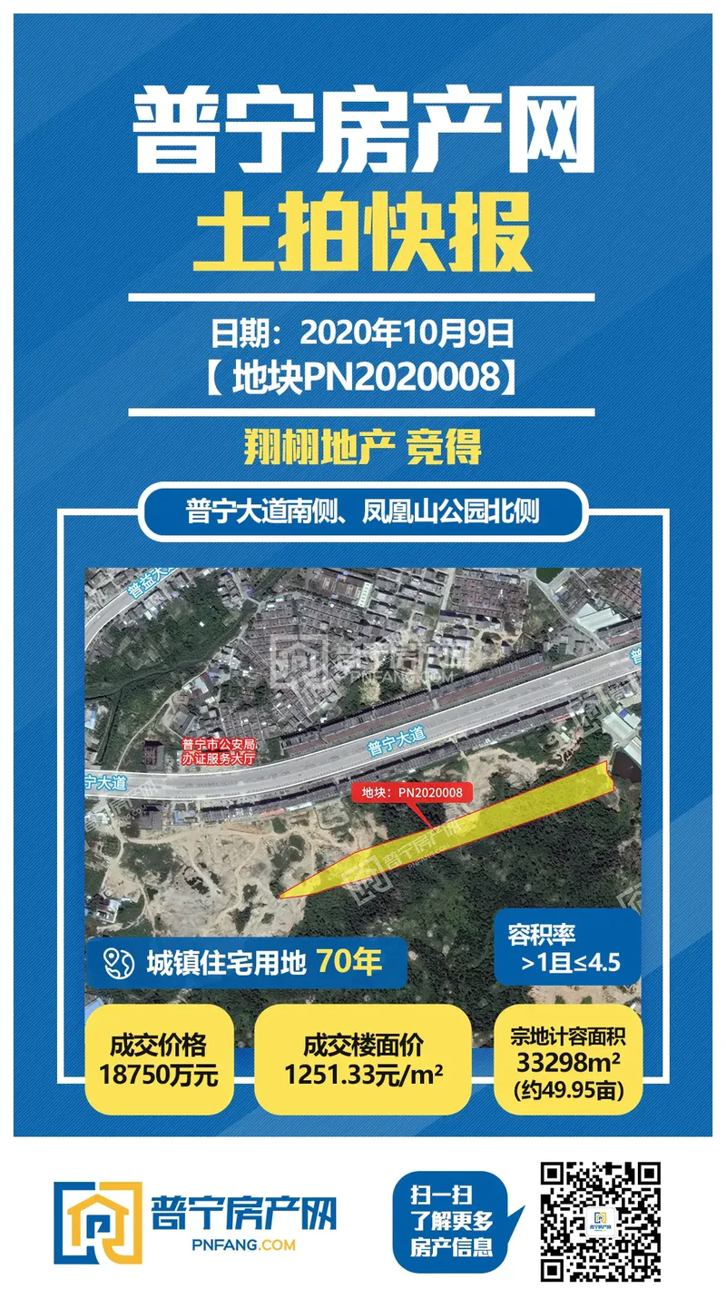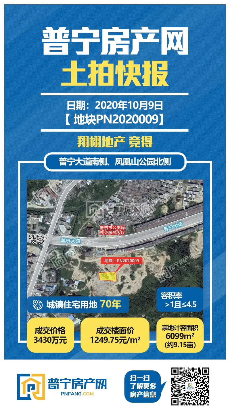 刚刚,普宁大道南侧、凤凰山公园北侧两幅地块合计约60亩住宅用地以底价2.218亿元成功出让。PN2020008地块成交总价1.875亿,折合楼面价1251.33元/㎡,PN2020009地块成交总价3430万,折合楼面价1249.75元/㎡,均由翔栩地产竞得。