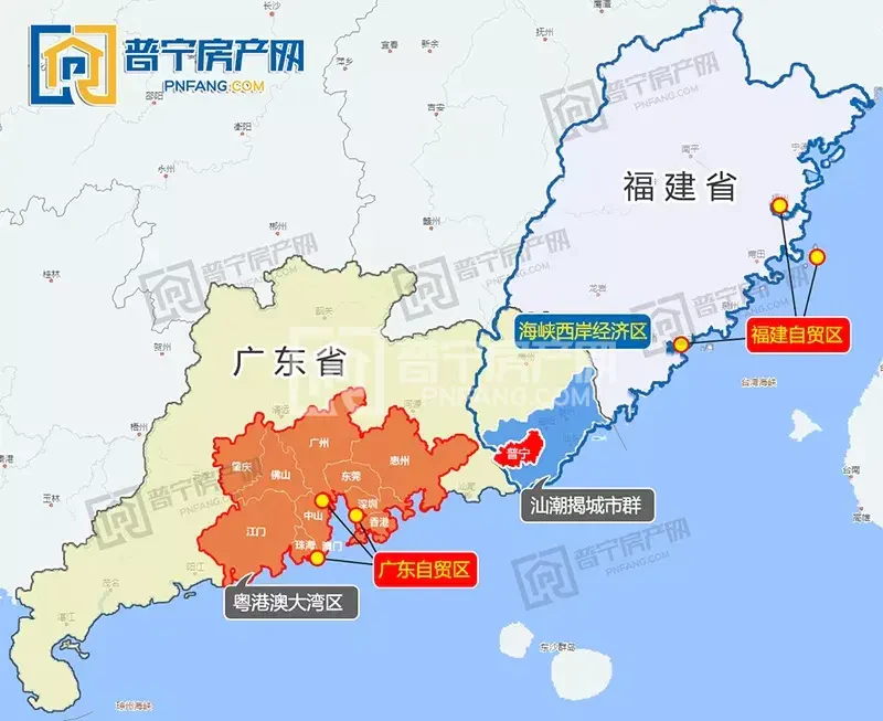 普宁作为粤港澳大湾区外延东片区域,地处广东、福建两大自贸区之间,又属于海峡西岸经济区范围内。在粤东城市群(汕潮揭城市群)中,占据绝对地理中心,为粤东陆上综合交通枢纽。