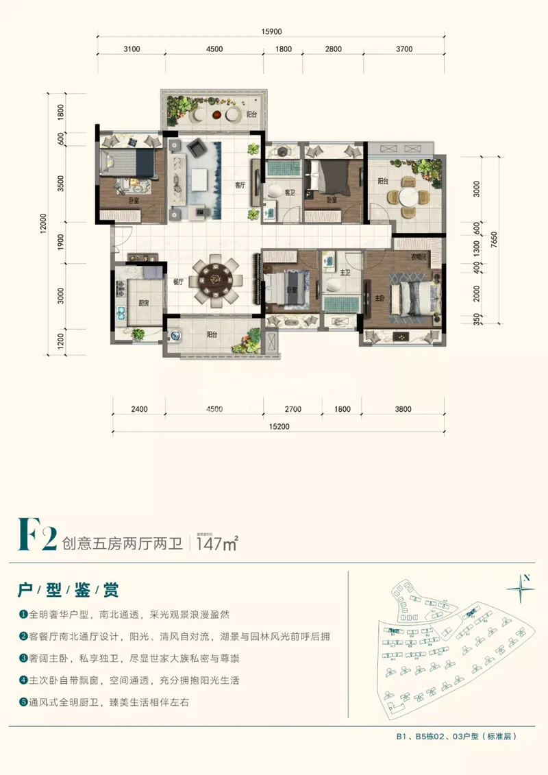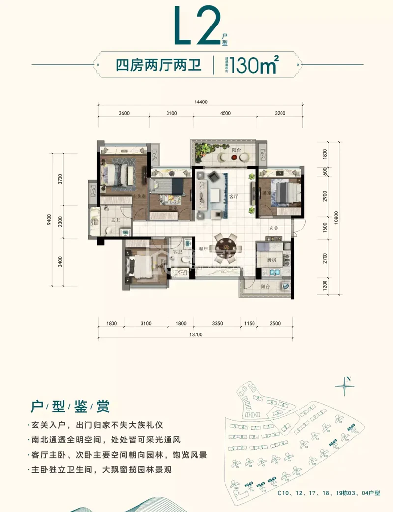 2.37综合容积率、平行式楼栋布局、最大76米楼距保证最佳采光及景观,大尺度向阳开间,南北双阳台,高拓赠送给业主更多的创意空间。