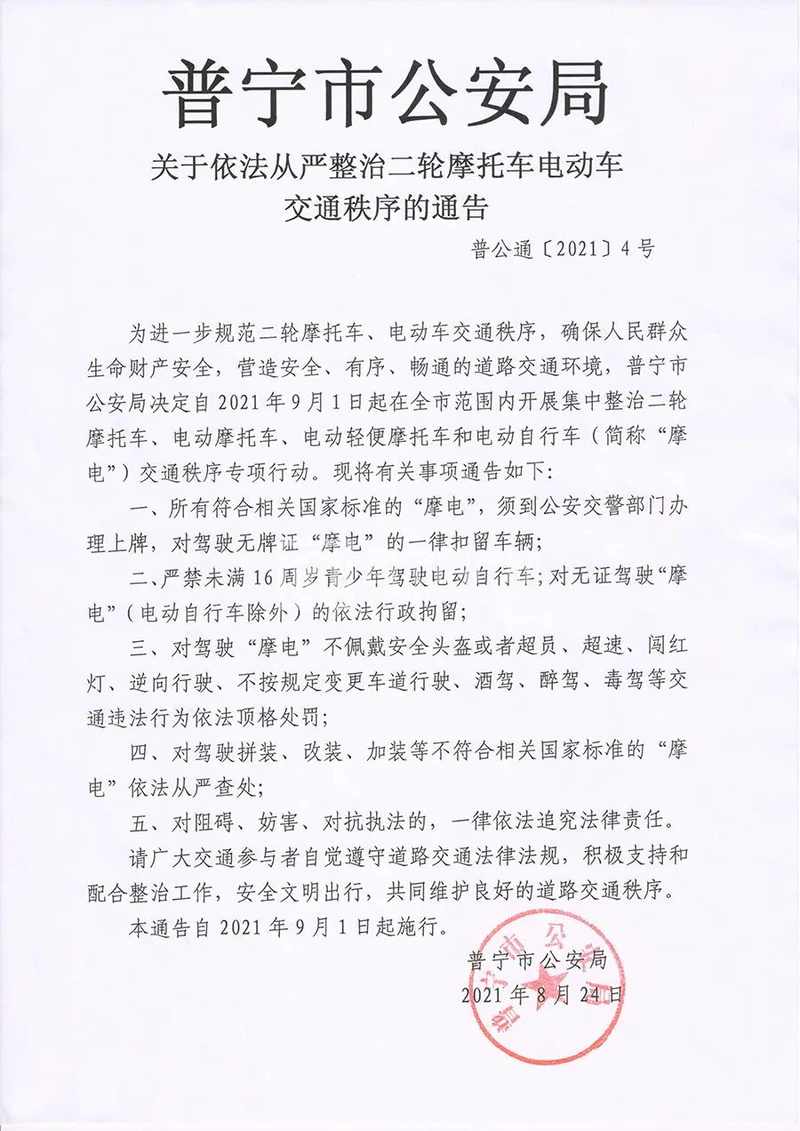为进一步规范二轮摩托车、电动车交通秩序,确保人民群众生命财产安全,营造安全、有序、畅通的道路交通环境,普宁市公安局决定自2021年9月1日起在全市范围内开展集中整治二轮摩托车、电动摩托车、电动轻便摩托车和电动自行车(简称“摩电”)交通秩序专项行动。现将有关事项通告如下: