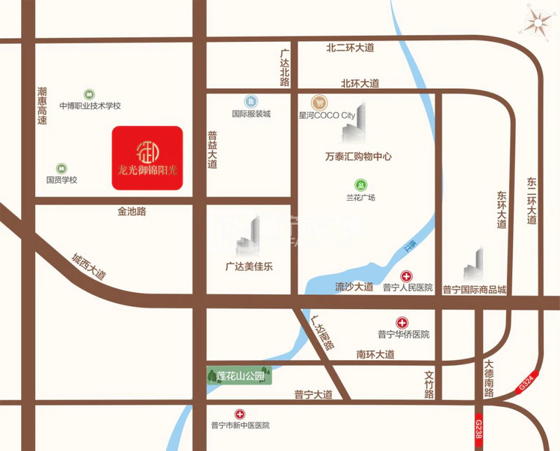 龙光御锦阳光花园择址于此,毗邻新兰花广场、莲花山公园等优美的生态资源,邻接国贤学校、中博职业技术学校等教育资源,临近普宁人民医院,普宁华侨医院,普宁市新中医医院等丰富的城市配套,打造城市人居范本。