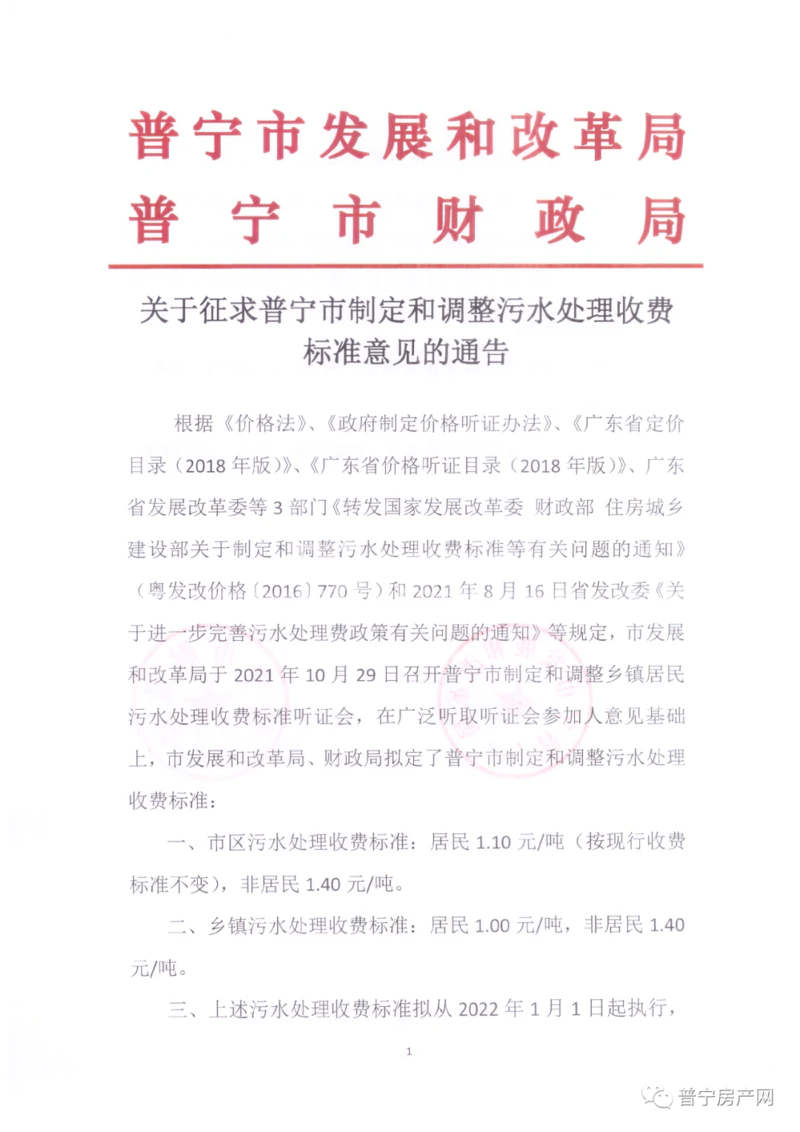 关于征求普宁市制定和调整污水处理收费标准意见的通告
