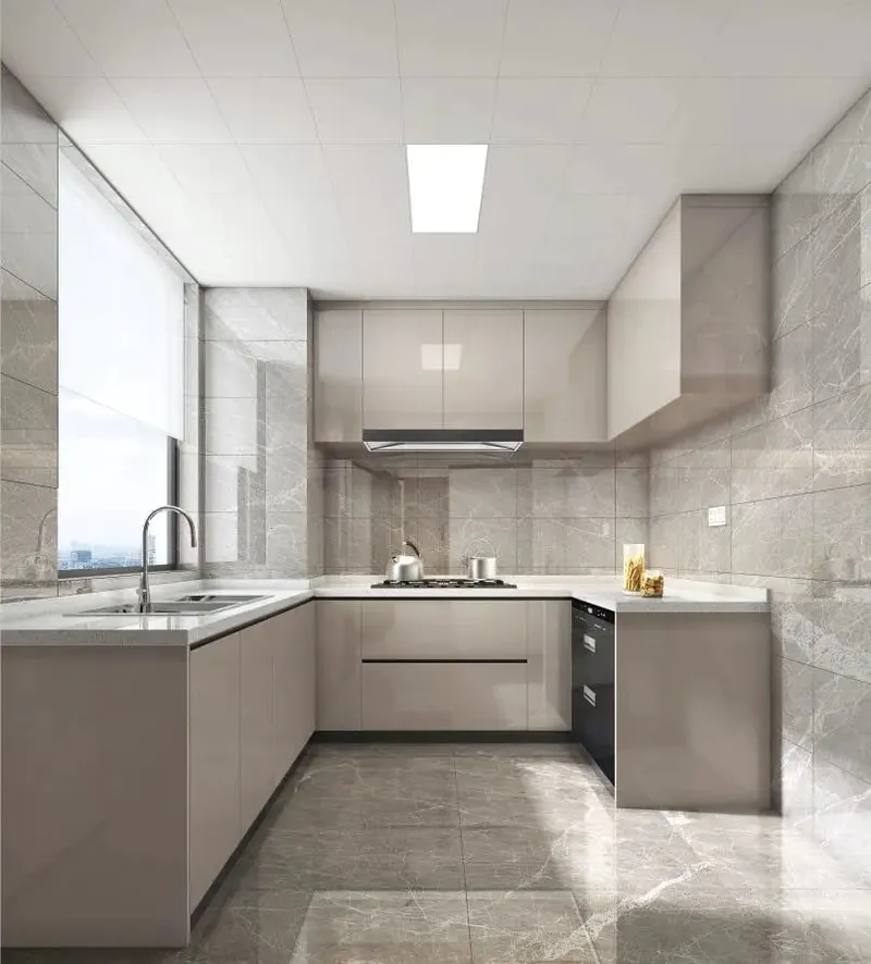 厨房:一体化储物橱柜,归类锅碗瓢盆,解决收纳难题。