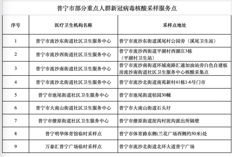我市在流沙7个街道、普宁明华体育馆、万泰汇普宁广场共设置9个24小时核酸采样点。