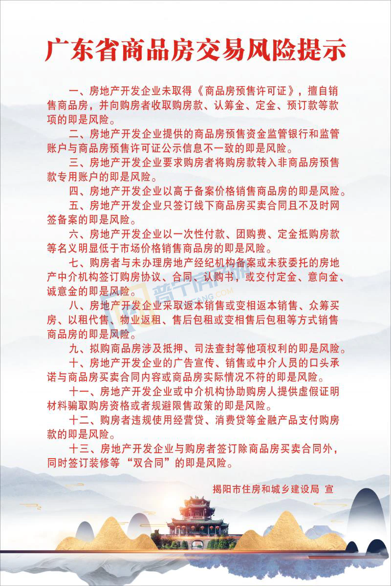 近日,揭阳市住房和城乡建设局发布了《广东省商品房交易风险提示》,提醒广大购房群众在购房时务必提高警惕,时刻注意防范以下13种风险,切实维护好自己的合法权益。具体内容如下: