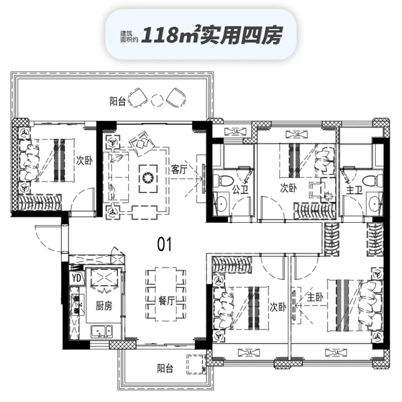 这一套建面约118㎡的户型,非常适合成长形家庭自住,一胎二胎都能有独立的房间,和父母同住也刚刚合适,亲戚朋友来做客也倍有面子。