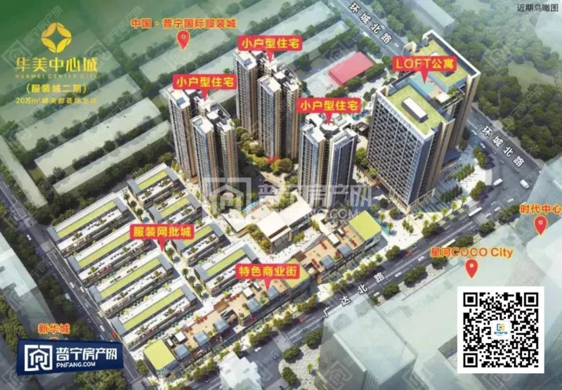 项目信息:华美中心城是由广东超亿美投资有限公司首创的商业街4.0,打造粤东商业新宠。项目坐落于环城北路与广达北路黄金交叉点,毗邻中国•普宁国际服装城一期,占据无可争议的城央核心地段。项目规划用地面积约为5.8万平方米,总建筑面积为20万平方米,规划建设特色商业街、服装网批城、LOFT公寓、小户型住宅及两层地下停车场。