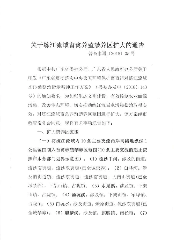 通告中提出为了切实推动练江流域水污染整治取得实效,对练江流域畜禽养殖禁养区进行扩大有了明确的范围。