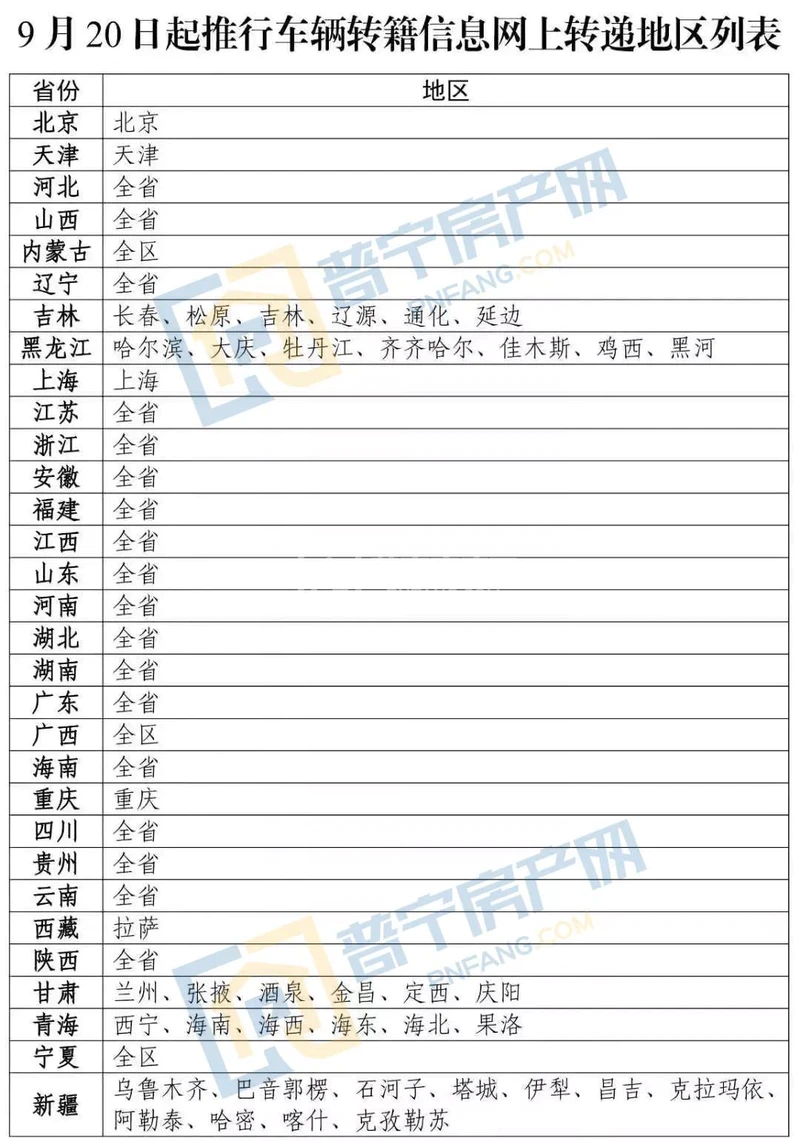 非营运小客车异地转籍的,可以直接到车辆迁入地申请,不再需要到迁出地车管所提档、验车,减少群众两地间往返,9月20日起实施城市由120个扩大至300个,年底前全国全面推行,每年将至少为群众节省交通等费用10多亿元。