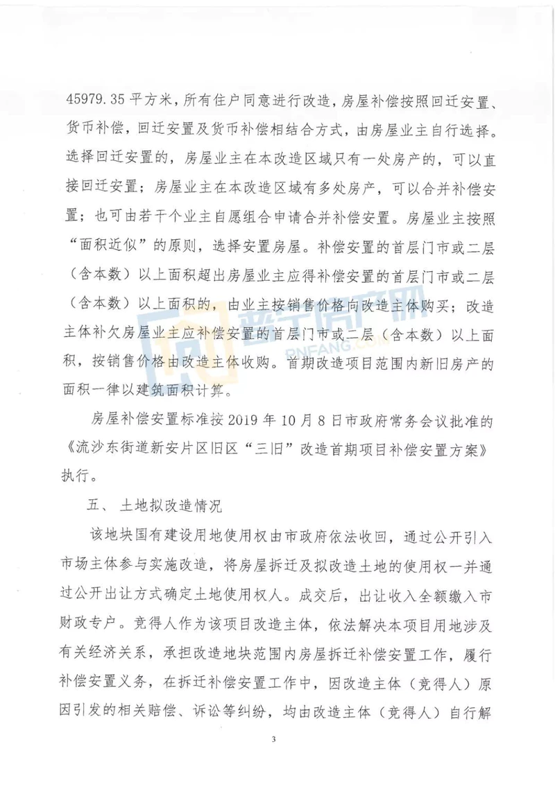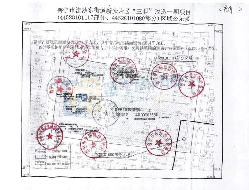 改造地块位于流沙东街道新安片区旧区范围内,已列入我市“三旧”改造计划,改造范围(东至长安街与新坛村交界处、西至新光南路、南至光平路、北至流沙大道),标图建库图斑编号为44528101080,44528101117,项目总占地面积约225亩。项目按照整体规划,分期实施的改造模式,采取成熟一片、改造一片,首期改造占地面积21050平方米(31.57亩),为上世纪70年代普宁县政府统征国有建设用地,改造范围东至安东街、西至新光南路、南至“豪门夜酒店”南侧道路、北至立新路。地上建筑物共10栋楼房,总建筑面积共45979.35平方米(不包括首层自建无房产证铺面、墙边围建物、天台建筑物、层高不足2.2米阁楼、临时附着物面积670.41平方米在内),土地房产权属涉及国有单位4个,私人业主187户。土地权属清晰,四至清楚,无争议。