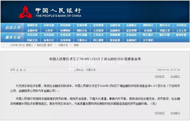 2020年1月1日下午,央行官网发文称,中国人民银行决定于2020年1月6日下调金融机构存款准备金率0.5个百分点(不含财务公司、金融租赁公司和汽车金融公司)。 央行表示,此次降准与春节前的现金投放形成对冲,银行体系流动性总量仍将保持基本稳定,保持灵活适度,并非大水漫灌,体现了科学稳健把握货币政策逆周期调节力度,稳健货币政策取向没有改变。 为支持实体经济发展,降低社会融资实际成本,中国人民银行决定于2020年1月6日下调金融机构存款准备金率0.5个百分点(不含财务公司、金融租赁公司和汽车金融公司)。 中国人民银行将继续实施稳健的货币政策,保持灵活适度,不搞大水漫灌,兼顾内外平衡,保持流动性合理充裕,货币信贷、社会融资规模增长同经济发展相适应,激发市场主体活力,为高质量发展和供给侧结构性改革营造适宜的货币金融环境。 解读 中国人民银行有关负责人表示:降准支持实体经济发展 1、此次降准如何支持实体经济? 答:此次降准是全面降准,体现了逆周期调节,释放长期资金约8000多亿元,有效增加金融机构支持实体经济的稳定资金来源,降低金融机构支持实体经济的资金成本,直接支持实体经济。 此次降准保持流动性合理充裕,有利于实现货币信贷、社会融资规模增长同经济发展相适应,为高质量发展和供给侧结构性改革营造适宜的货币金融环境,并且用市场化改革办法疏通货币政策传导,有利于激发市场主体活力,进一步发挥市场在资源配置中的决定性作用,支持实体经济发展。 2、此次降准是否有利于缓解小微、民营企业融资难融资贵问题? 答:此次降准增加了金融机构的资金来源,大银行要下沉服务重心,中小银行要更加聚焦主责主业,都要积极运用降准资金加大对小微、民营企业的支持力度。在此次全面降准中,仅在省级行政区域内经营的城市商业银行、服务县域的农村商业银行、农村合作银行、农村信用合作社和村镇银行等中小银行获得长期资金1200多亿元,有利于增强立足当地、回归本源的中小银行服务小微、民营企业的资金实力。同时,此次降准降低银行资金成本每年约150亿元,通过银行传导可降低社会融资实际成本,特别是降低小微、民营企业融资成本。 3、降准是否意味着稳健货币政策取向发生改变? 答:此次降准与春节前的现金投放形成对冲,银行体系流动性总量仍将保持基本稳定,保持灵活适度,并非大水漫灌,体现了科学稳健把握货币政策逆周期调节力度,稳健货币政策取向没有改变。(完)