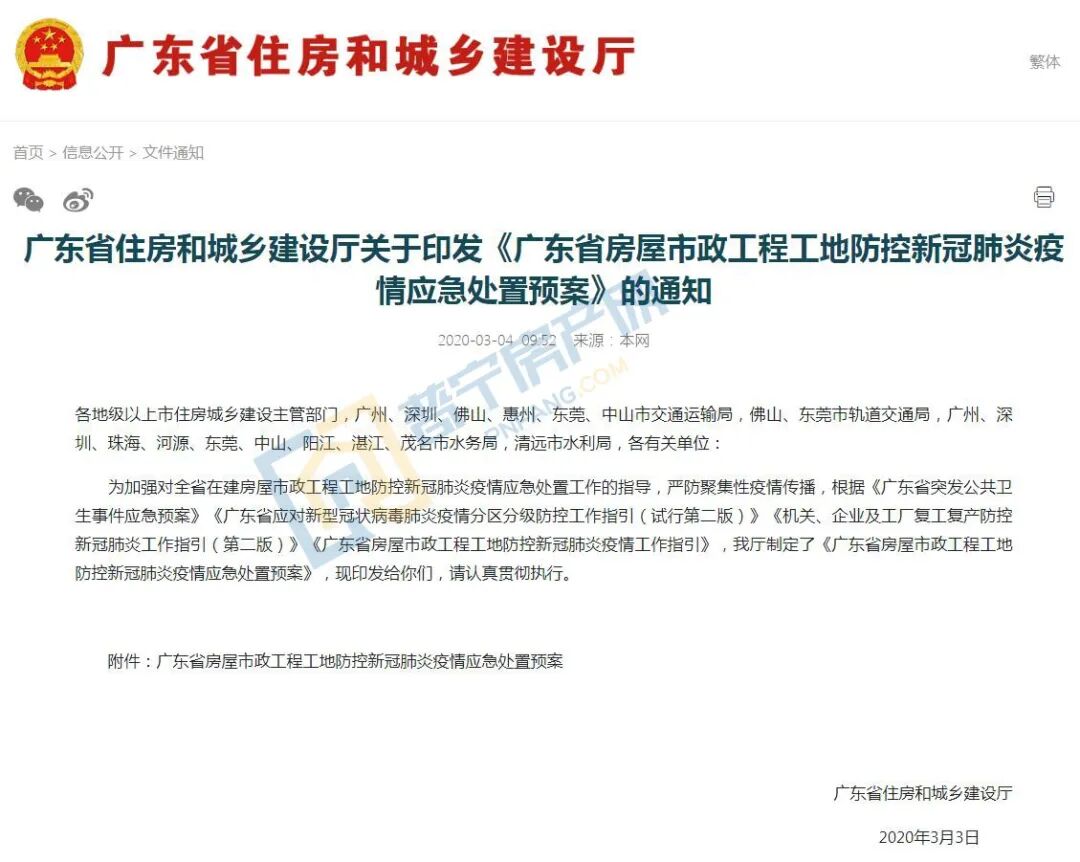 近日,广东省住房和城乡建设厅发布关于印发《广东省房屋市政工程工地防控新冠肺炎疫情应急处置预案》的通知,加强对全省在建房屋市政工程工地防控新冠肺炎疫情应急处置工作的指导,严防聚集性疫情传播。该预案实施时间自印发之日起至疫情结束。
