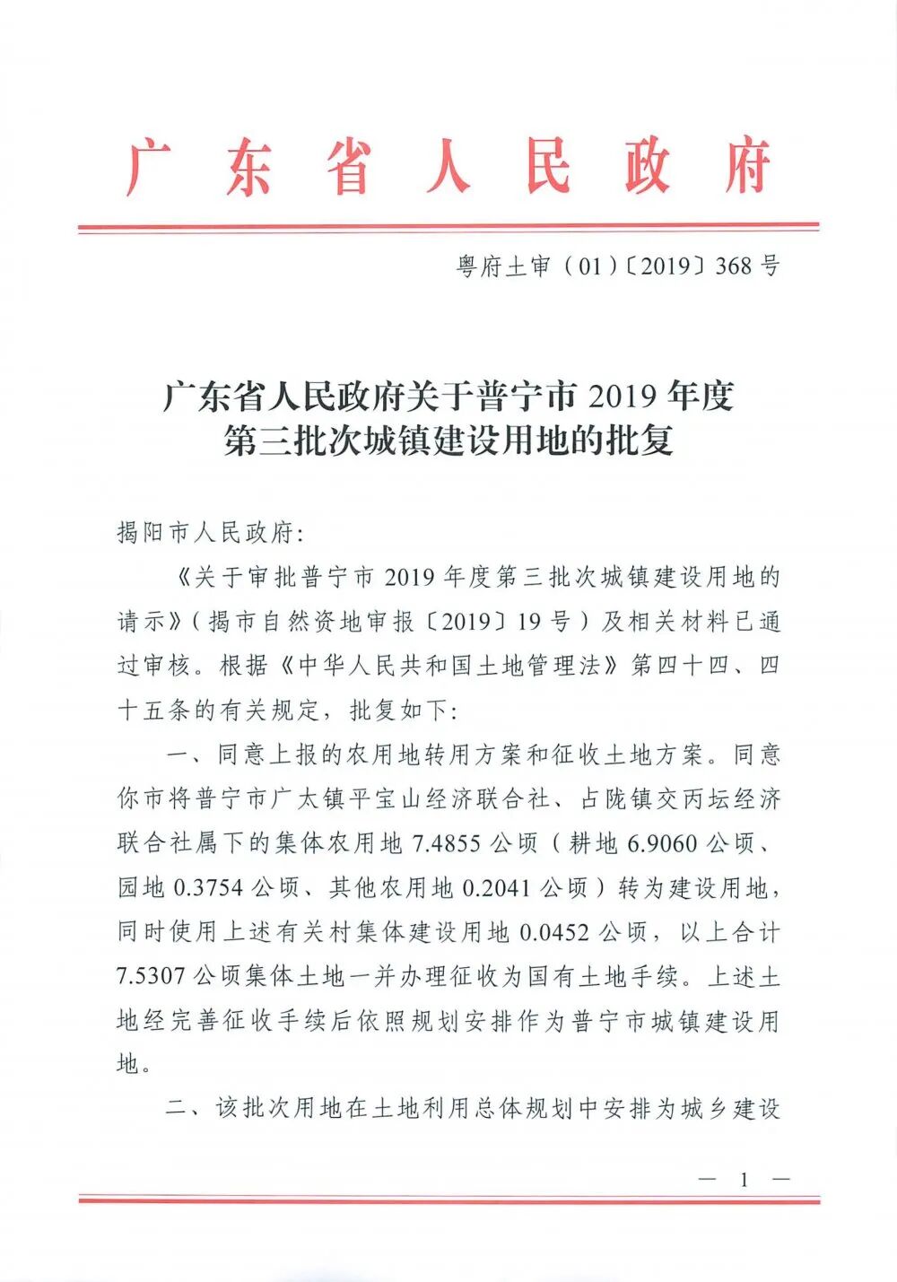 据市人民政府相关文件显示,普宁市2019年度第三批次城镇建设用地包括了占陇镇交丙坛村和广太镇平宝山村的地块,合计面积为7.5307公顷(折合约112.96亩),其中将征收占陇镇交丙坛7.1418公顷(折合107.13亩)的土地,将作为工矿仓储用地。