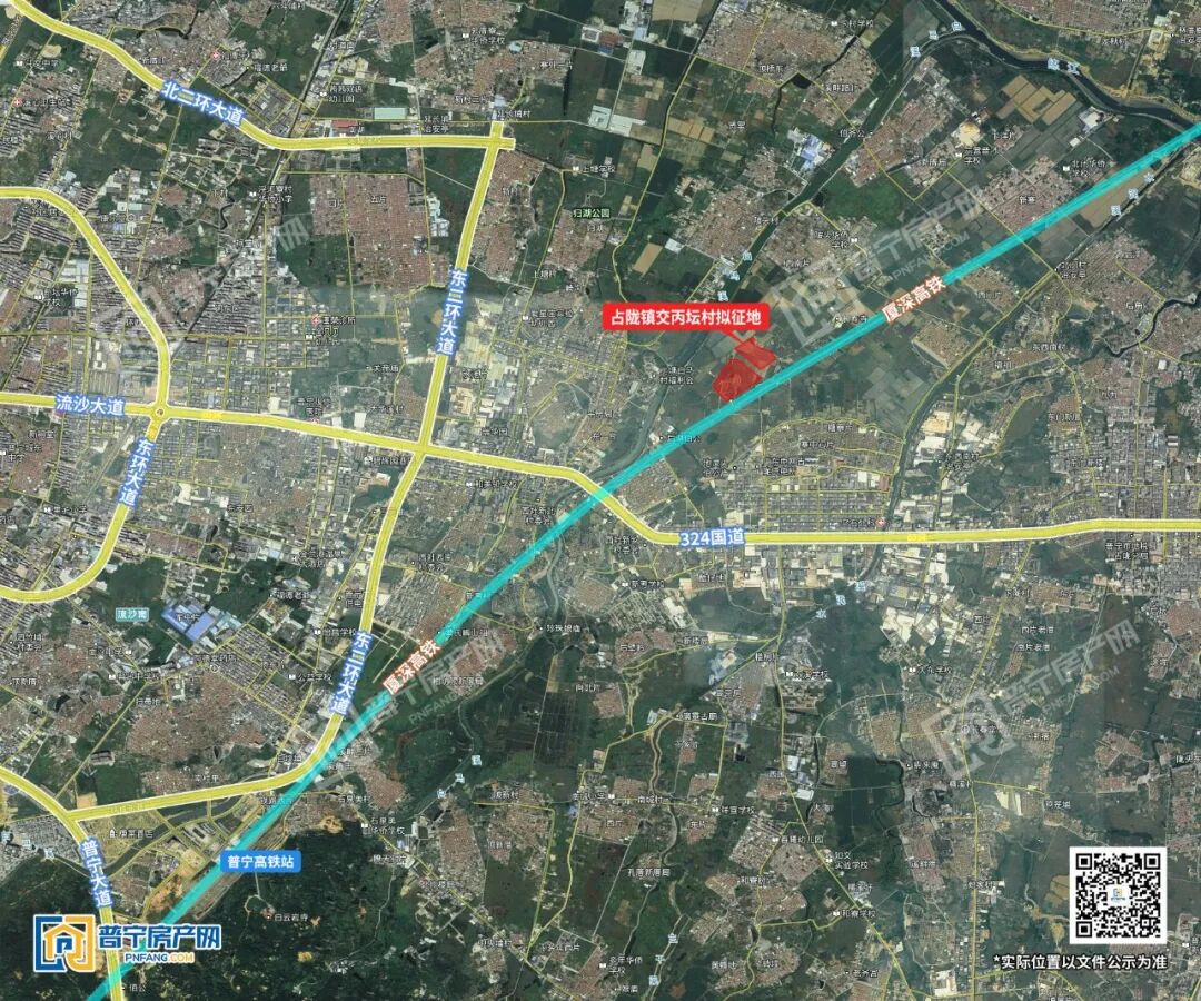 近日,普宁市人民政府发布了普宁市2019年度第三批次城镇建设用地的征地公告,据公告显示,该地块位于占陇镇交丙坛村,征收面积为7.1418公顷(折合107.13亩),具体如下所示: