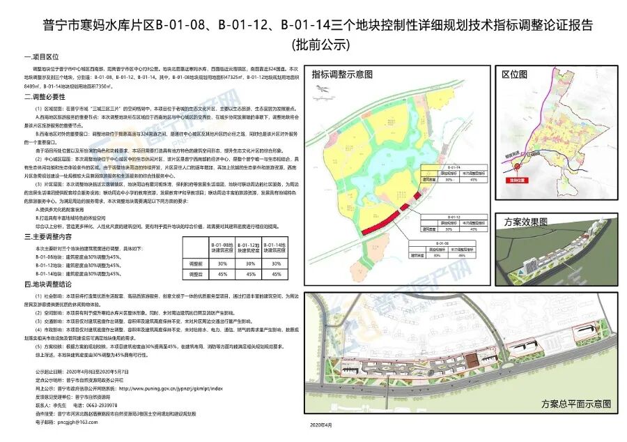 四、地块调整结论 (1)社会影响:本项目将打造集优质生活配套、高品质旅游服务、创意文娱于一体的优质服务型项目,通过打造丰富的建筑空间,为周边居民及游客提供更优质的休闲购物体验。 (2)空间影响:本项目有利于提升寒妈水库片区整体形象。同时,未对周边建筑的日照及消防产生影响。 (3)交通影响:本项目仅对建筑密度作出调整,容积率及建筑高度保持不变,未对片区周边交通出行量产生影响。 (4)市政影响:本项目仅对建筑密度作出调整,容积率及建筑高度保持不变,未对险排水、电力、通信、燃气的需求量产生影响,按原规划提高相关市政设施及管网建设后可满足地块使用的需求。 (5)方案校核:根据方案的规划校核,本项目建筑密度由30%提高至45%,在建筑布局、消防等方面均能满足相关规划规范要求。 综上所述,本地块建筑密度由30%调整为45%具有可行性。