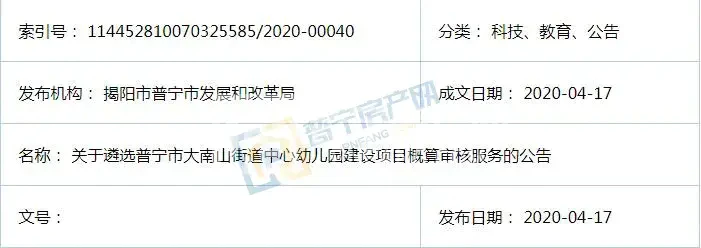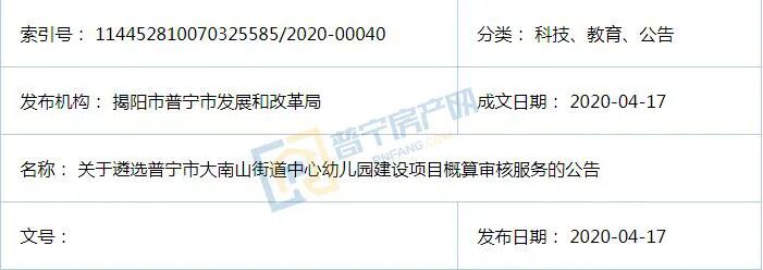 近日,普宁市发展和改革局发布了《关于遴选普宁市大南山(楼盘详情户型图相册地图)街道中心幼儿园建设项目概算审核服务的公告》,具体内容如下: