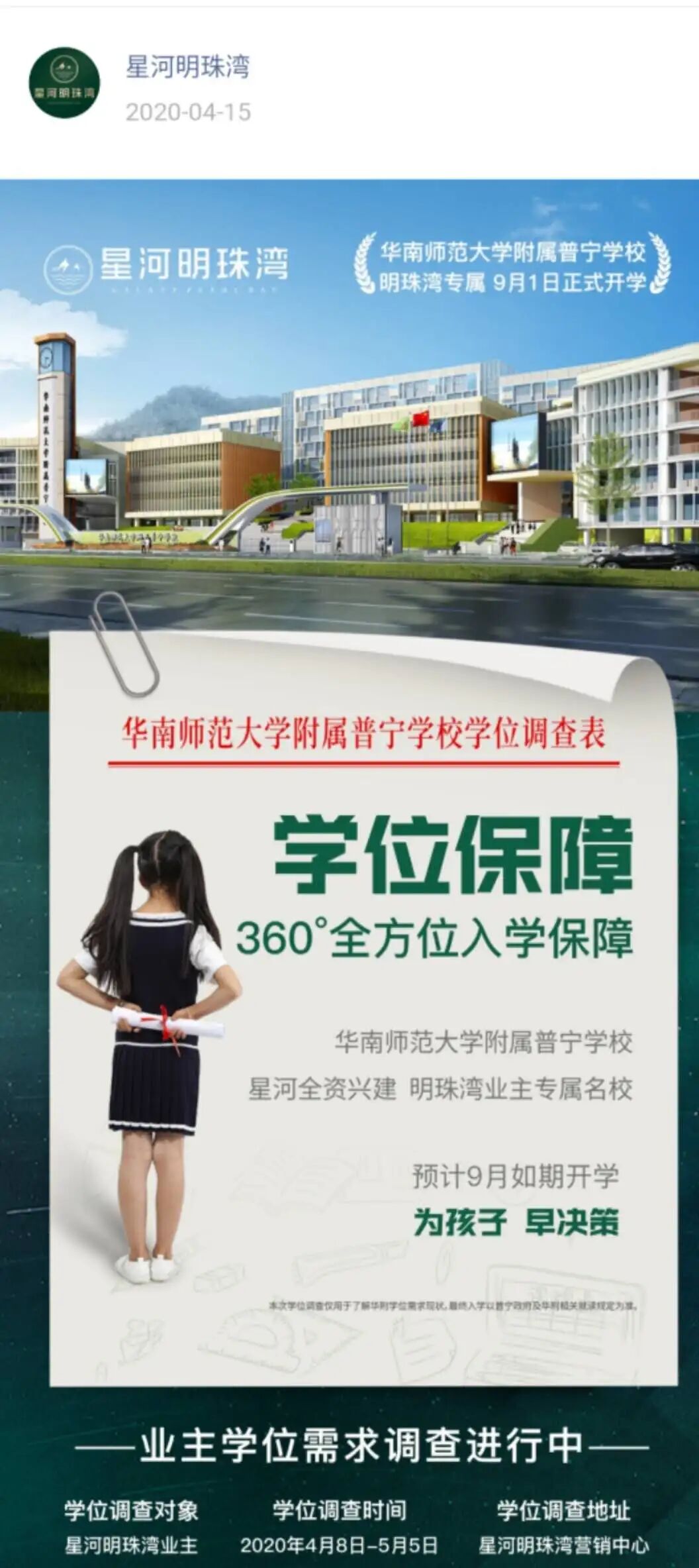就在近日,小房君看到星河明珠湾发起的关于华南师范大学附属普宁学校学位调查表,其中提到学位保障。