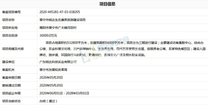 近日,小房君从相关网站了解到,普宁市铭达生态康养旅游建设项目通过备案。