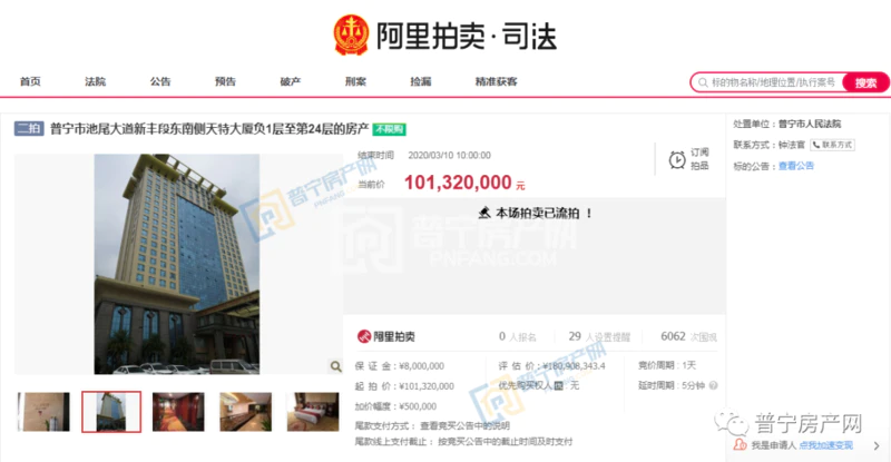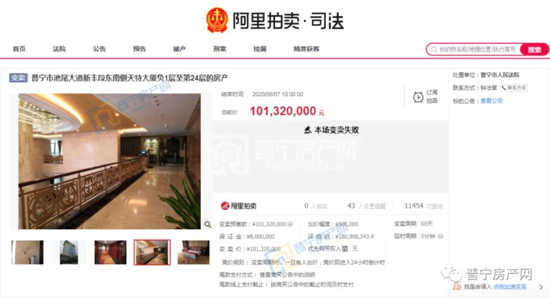 普宁黄金国际假日酒店(负1层至第24层)进行第三次公开拍卖,拍卖周期调整为60天,活动于8月7日结束。黄金假日酒店拍卖起步价为1.0132亿元,11455次围观,还是无人报价,最终本场变卖以失败告终。