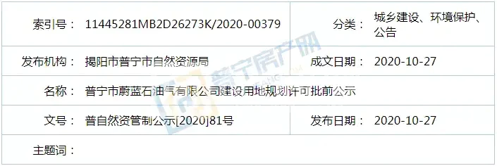 近日,普宁市自然资源局发布了普宁市蔚蓝石油气有限公司建设用地规划许可批前公示,具体内容如下: