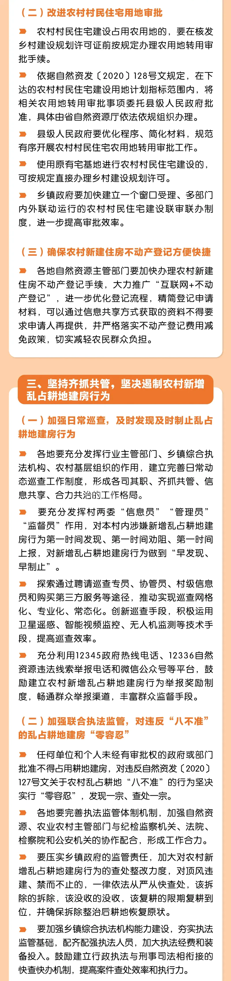 《通知》强调,要切实保障农村村民住宅建设合理需求。确保农村建设用地规模和指标落实落地。农村村民建设住宅应符合村庄规划并优先使用存量建设用地、村内空闲地,不得占用永久基本农田,且应尽量避免占用耕地尤其是水田,确实难以避让的,由县级政府负责统一落实耕地占补平衡,县域范围内确实无法落实占补平衡的,可按规定在市域或省域范围内落实。其中,农村村民住宅建设用地计划指标专项用于保障农村村民住宅建设合理用地需求,年底实报实销,当年保障不足的,在下一年度优先保障。 《通知》提出,要改进农村村民住宅用地审批。农村村民住宅建设占用农用地的,要在核发乡村建设规划许可证前按规定办理农用地转用审批手续。在下达的农村村民住宅建设用地计划指标范围内,将相关农用地转用审批事项委托县级人民政府批准。使用原有宅基地进行农村村民住宅建设的,可按规定直接办理乡村建设规划许可。 同时,确保农村新建住房不动产登记方便快捷。要求各地自然资源主管部门加快办理农村新建住房不动产登记手续,大力推广“互联网+不动产登记”,可以通过信息共享方式获取的资料不得要求申请人再提供,严格落实不动产登记费用减免政策,切实减轻农民群众负担。 在坚决遏制农村新增乱占耕地建房行为方面,《通知》要求对新增乱占耕地建房行为做到“早发现、早制止”,鼓励建立农村新增乱占耕地建房行为举报奖励制度。要求各地把农村新增乱占耕地建房查处整改工作作为土地执法监督的重要内容,并将土地执法监督情况纳入耕地保护责任目标考核。 《通知》提出,各地可探索建立乡镇、村工作绩效与遏制新增乱占耕地建房行为相挂钩的考核机制,对因工作不力、监管不到位导致出现新增乱占耕地建房的,给予相应惩罚;对工作得力、监管到位,没有出现新增乱占耕地建房的,给予适当奖励。