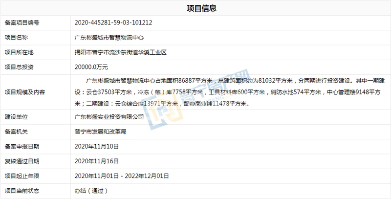 今天,小房君从相关平台了解到,位于普宁市流沙东街道华溪工业区的广东彬盛城市智慧物流中心正式备案通过。