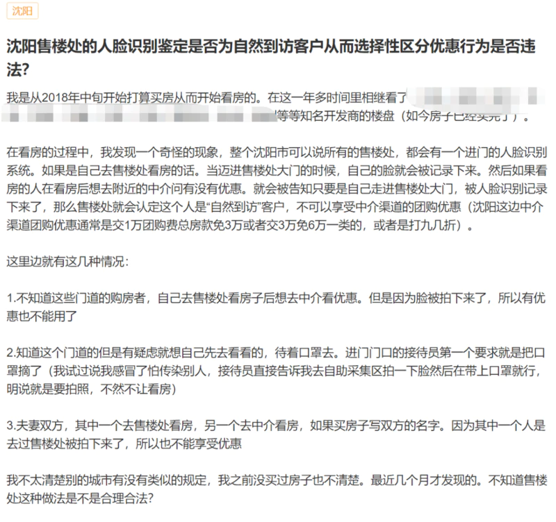 原来,一个月前,这位网友通过中介购买了XX文苑的一套房屋。但在8月4日,他被售楼处告知,售楼处的人脸识别系统曾经识别到与他相似的人独自看房,因此他属于自然到访客户,不属于中介渠道客户,不能享受渠道优惠。