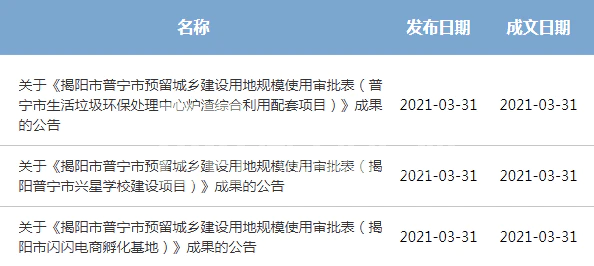 近日,普宁市又有三个预留城乡建设用地规模使用审批表成果公告,普宁市生活垃圾环保处理中心炉渣综合利用配套项目、普宁市兴星学校建设项目、揭阳市闪闪电商孵化基地这三个项目属于近期具备建设条件、急需落位建设的重要产业项目,符合预留城乡建设用地规模使用条件,落实地块总面积6.3425公顷(约95.14亩),落实后全部调整为规划城乡建设用地。