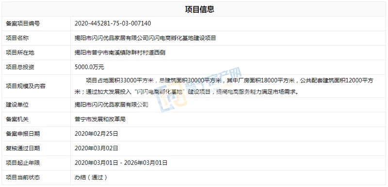 据了解,闪闪电商孵化基地建设项目由揭阳市闪闪优品家居有限公司建设,总投资5000万元,项目占地面积33000平方米,总建筑面积30000平方米,其中厂房面积18000平方米,公共配套建筑面积12000平方米;通过加大发展投入“闪闪电商孵化基地”建设项目,提高电商服务能力满足市场需求。