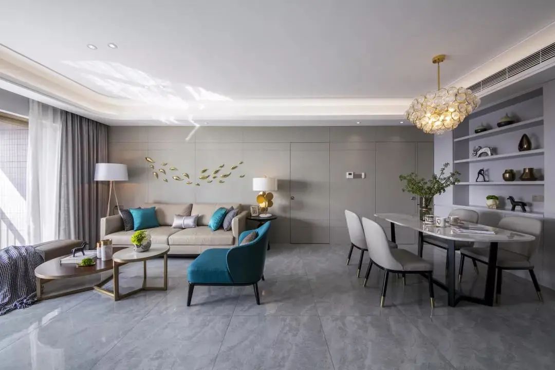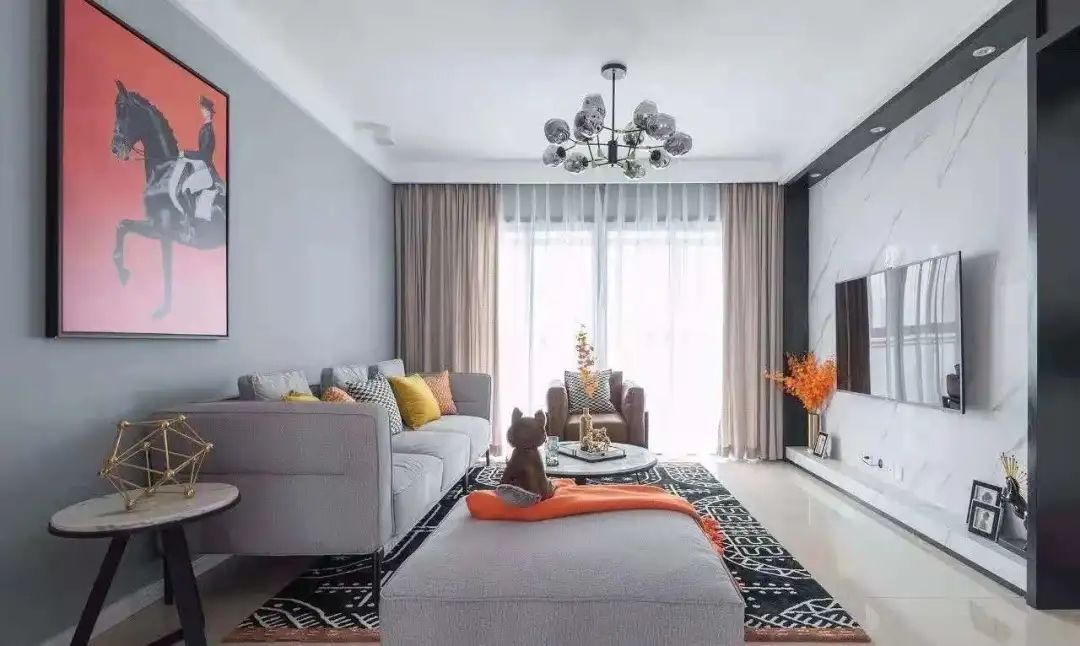 但在黑白灰的基础上,再来一点点亮色点缀,就能让住宅焕发个性的现代气息。这种黑白灰+亮色的搭配公式,还能让我们在未来只局部更换家中的软装饰品,比如抱枕、地毯、装饰画、摆件,就能轻松改变家的风格印象,让家实现百变效果。