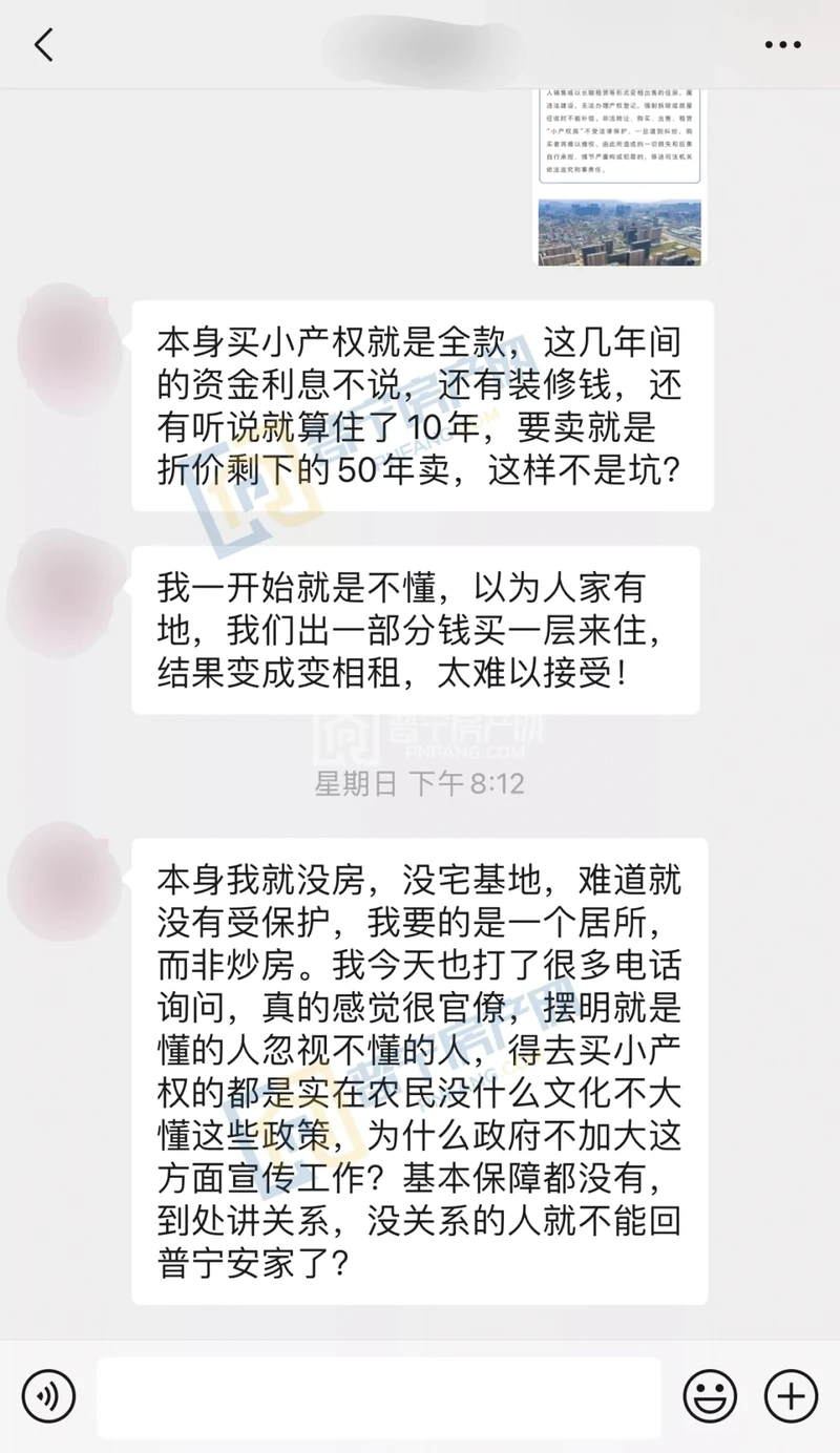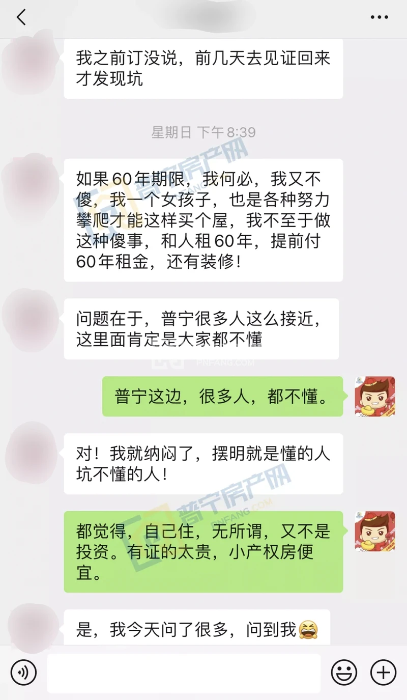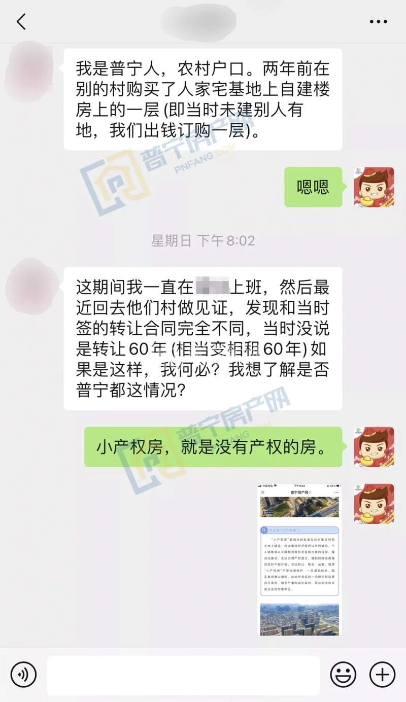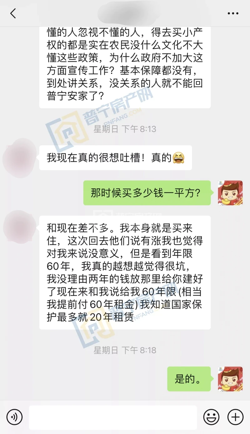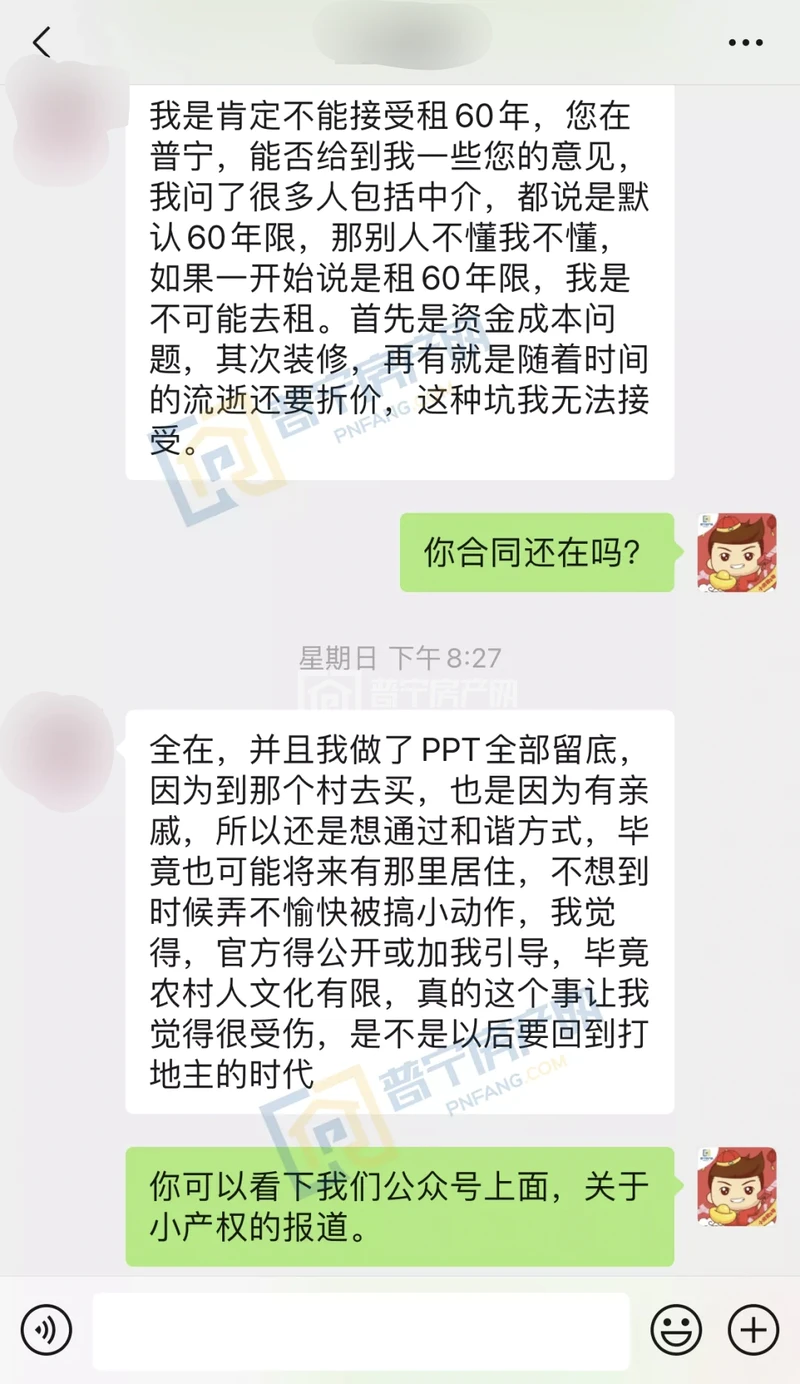 网友表示对于这套全款购置的小产权房只有60年租赁权完全不能接受,她本人对于普宁小产权房的政策也不太了解,希望有关部门能加以引导和科普。