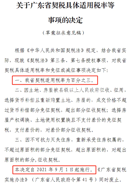 不少朋友也同样关心二套房的契税税率会不会有所变化,不用担心,根据《关于广东省契税具体适用税率等事项决定》(草案征求意见稿)显示,其中并未对我省契税税率作出变化,此决定于今年9月1日起开始施行,广东省契税适用税率依旧为3%。