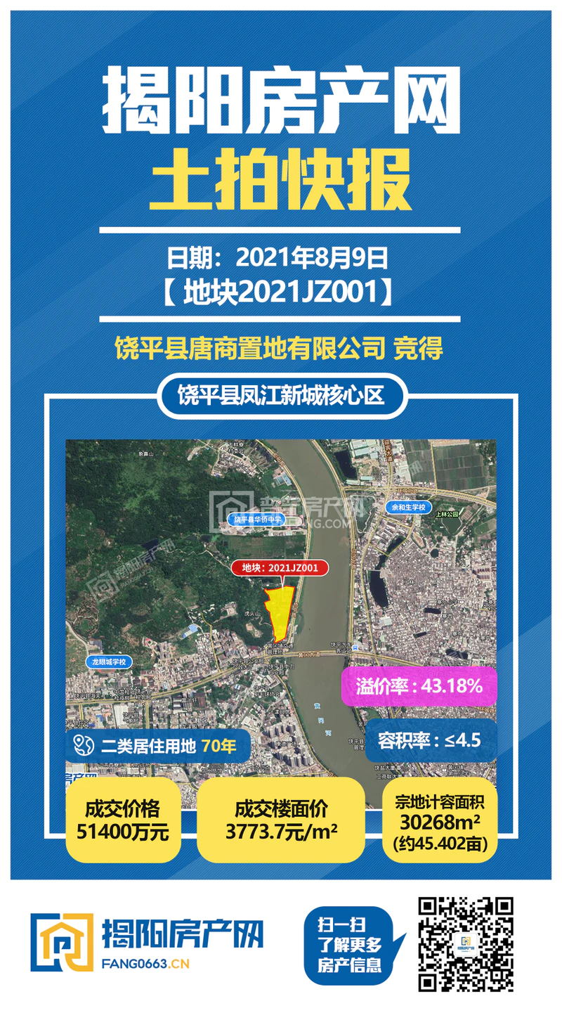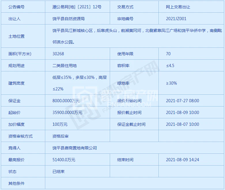 今天,潮州市成功出让饶平县一宗二类居住用地(宗地编号2021JZ001),该宗地经过136轮激烈争夺,被“饶平县唐商置地有限公司”以51400万元夺得,溢价率达43.18%,楼面价为3773.7元/㎡。