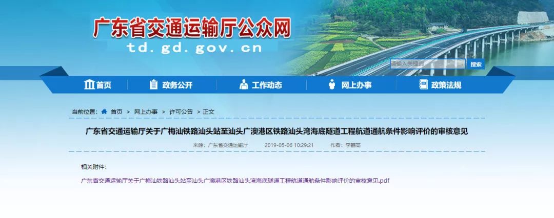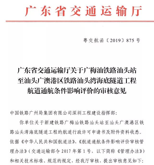 近日,广东省交通运输厅发布《关于广梅汕铁路汕头站至汕头广澳港区铁路汕头湾海底隧道工程航道通航条件影响评价的审核意见》(下文简称《意见》)。