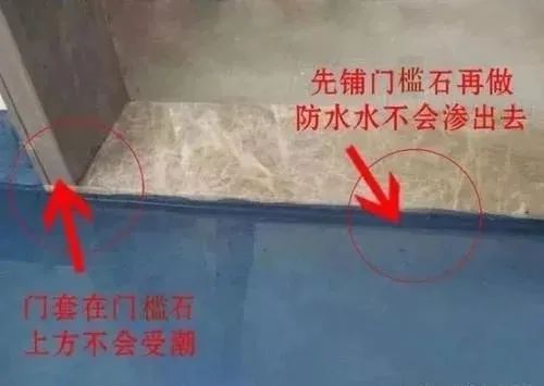 门槛石防水,其实就是止水墩(止水坎)。测量门槛石的时候,要把门套两边也计算进去,这样在门套安装时,将门套安装在门槛石上,两边使用堵漏王进行封堵,下方也要做防水。这样卫生间地面的水源和潮气就无法影响到门套。