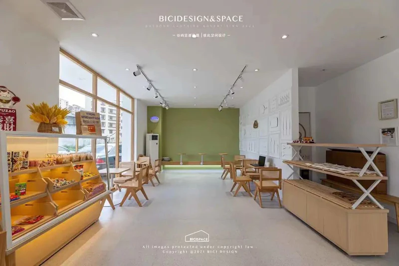 谷屿吉面包屋店铺整体色调轻松、整洁而舒适温馨,白色、绿色、原木色主色调装扮,温馨的气氛,香甜的面包,营造出放松的甜蜜消费体验。