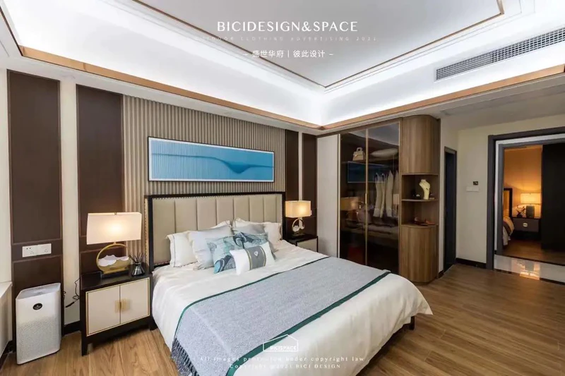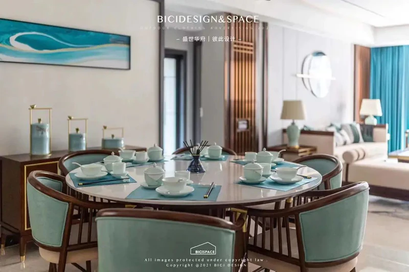 在暗色调的基础上又辅以红、蓝、绿等亮色作为局部点缀,配色更加大胆、明快而富有个性,风雅韵味呼之欲出。陈设不过于浮夸,纯粹的色彩搭配光影的变化,婉约别致。将现代语言与传统文化得以圆融合一,简约轻奢之美又注入了东方韵味的意境。