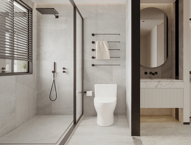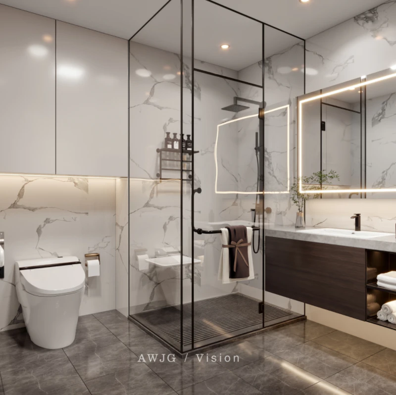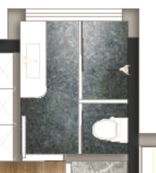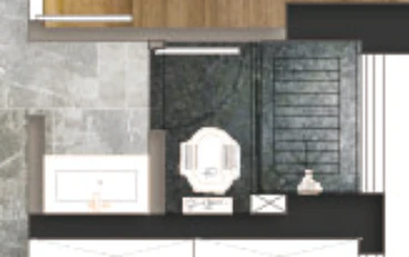 主卫进门右侧墙做马桶淋浴间,四周加玻璃隔断,外面做一个长洗手台,靠窗光线好。