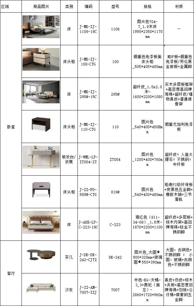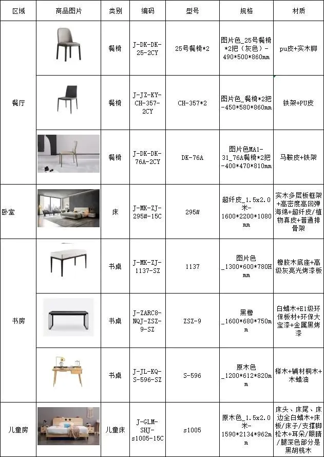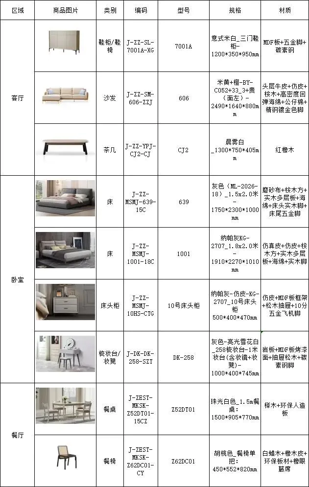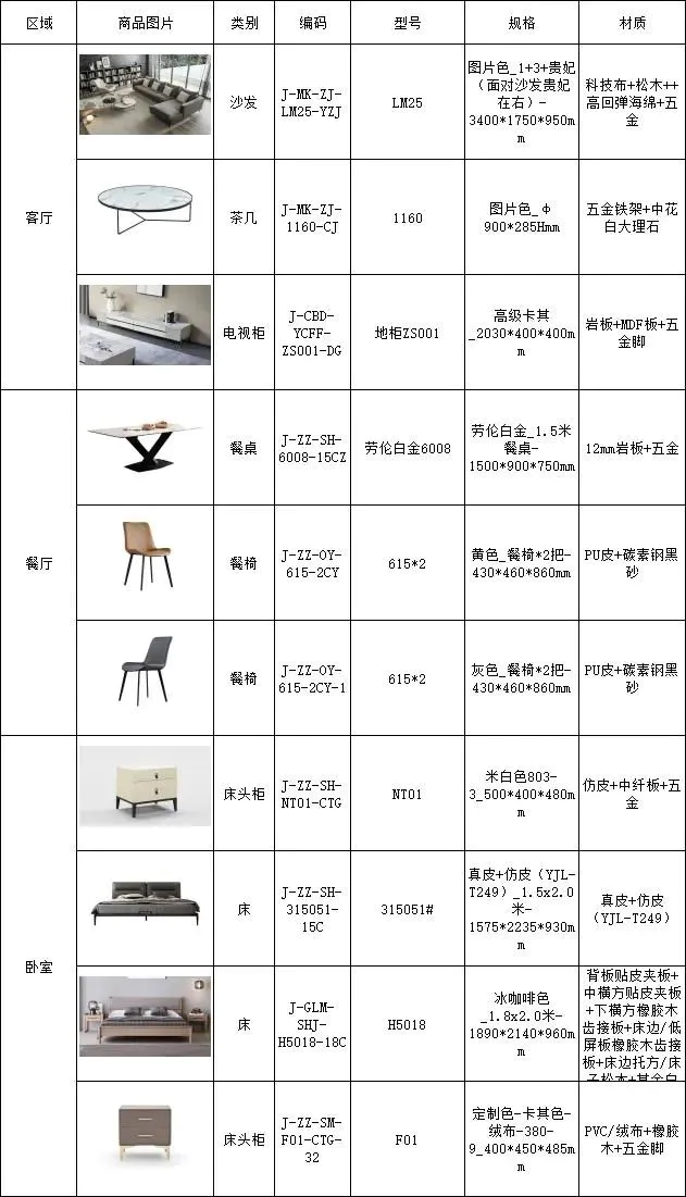 136㎡主要家具清单