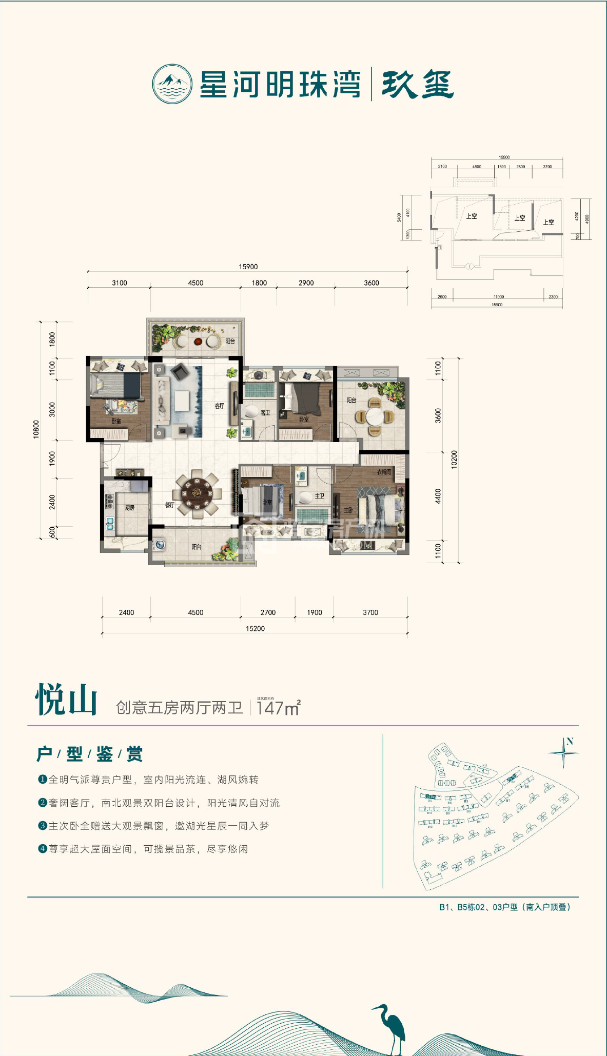 - 北区由10栋3层双排别墅,2栋高层楼王,2栋洋房组成,南区由21栋29-33层高层住宅,8栋10层洋房住宅组成。