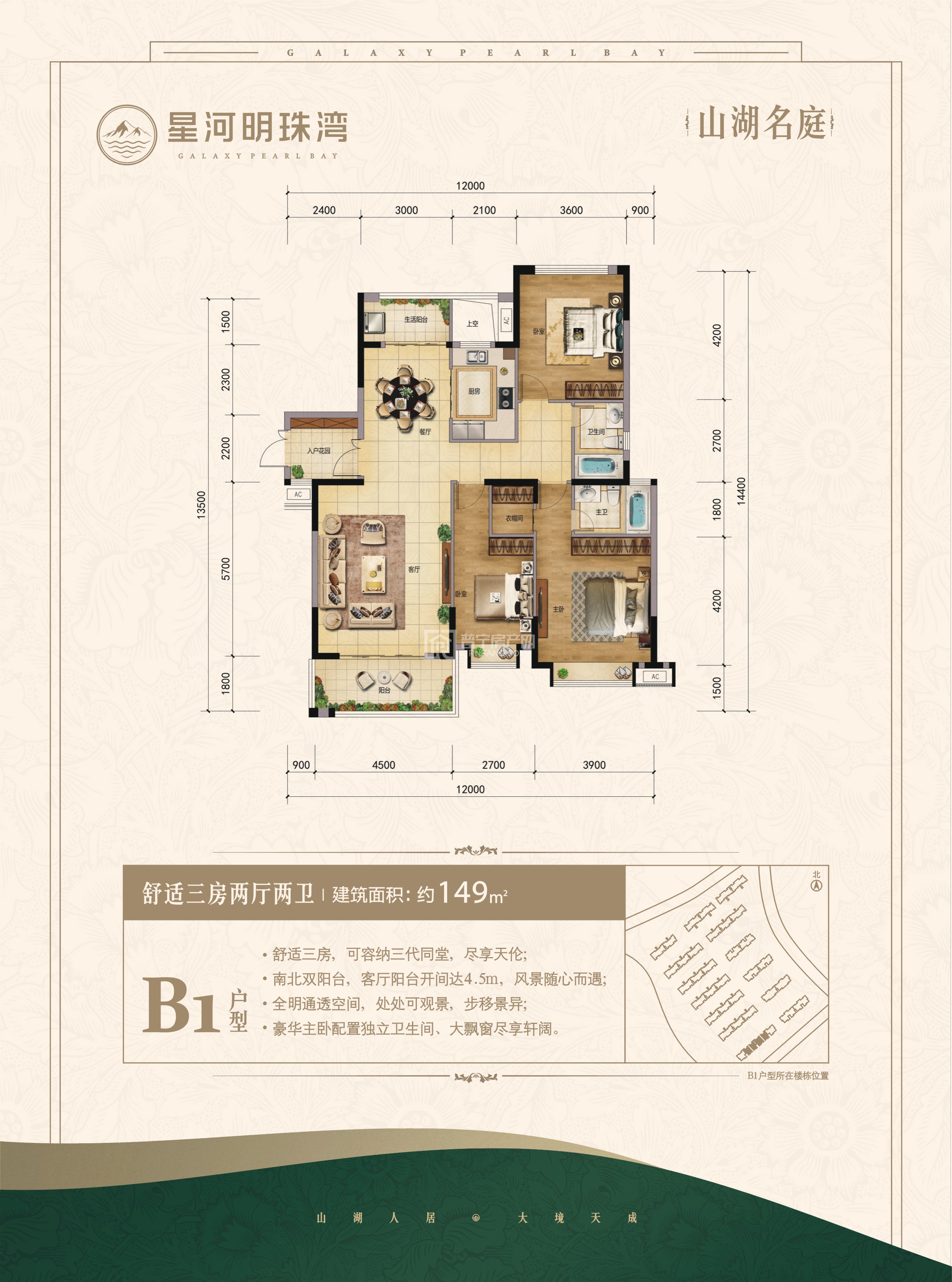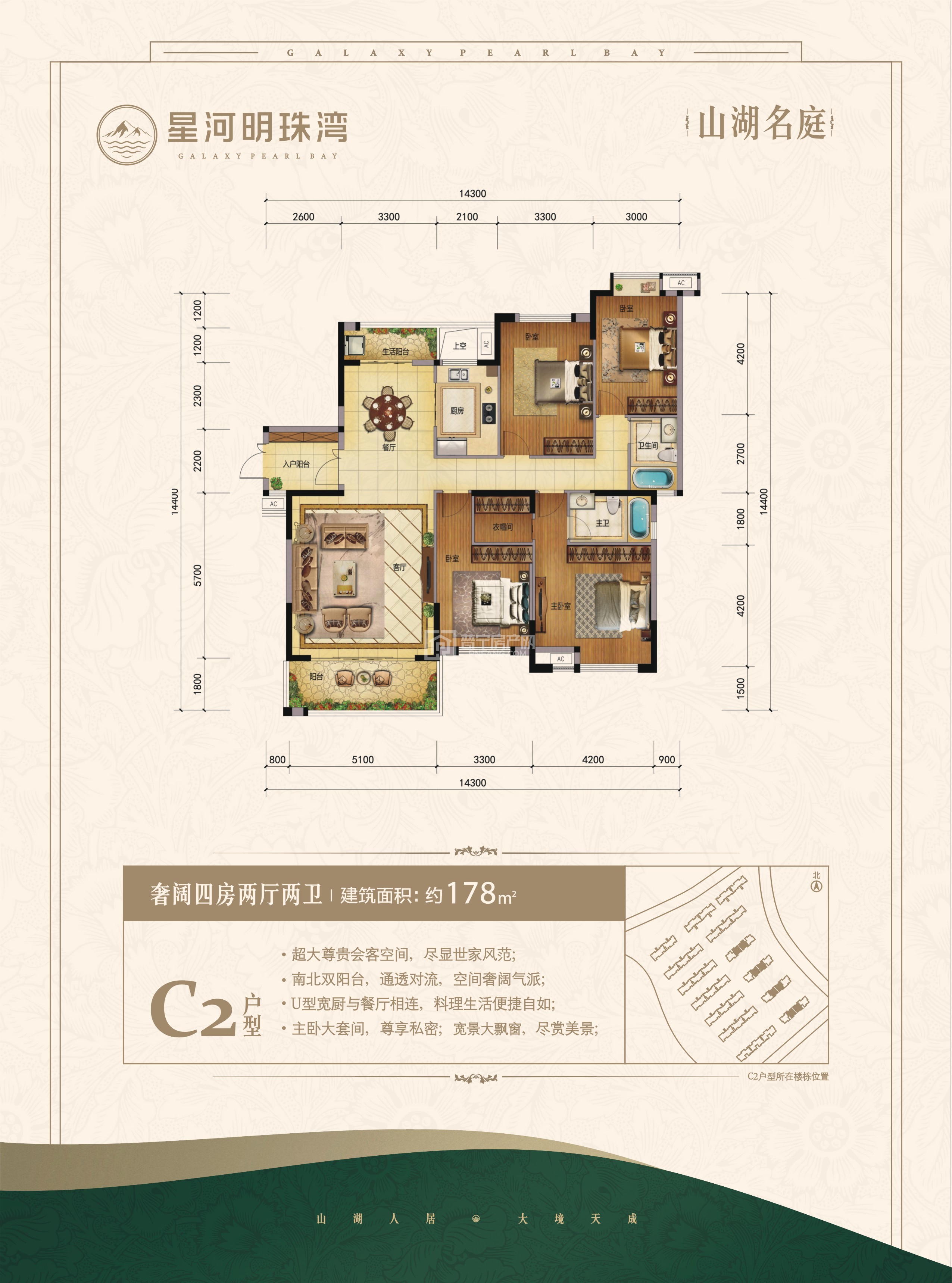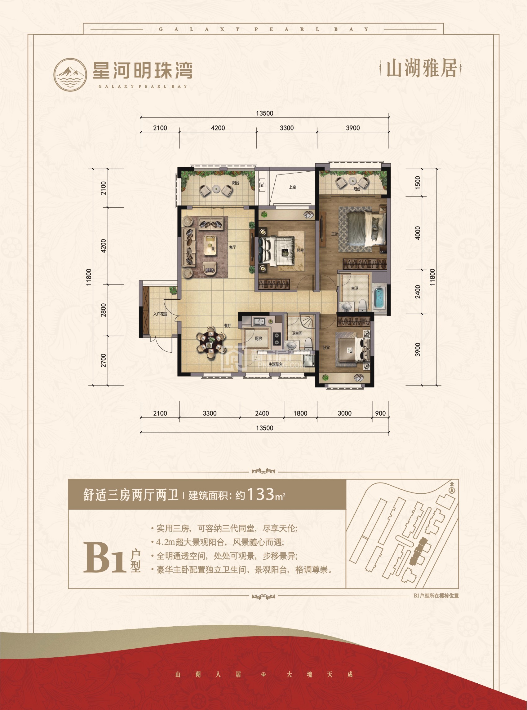 - 星河明珠湾位居普宁西南CLD(中央生活区),临近普惠高速池尾高速口,10分钟抵达高铁普宁站,交通便捷,环境优美。项目总占地面积5000亩,环抱1200亩天然寒妈湖,总建筑面积超300万平方米,以大社区、大资源、大教育、大商业、大体育五大配套理念,打造普宁首席湖山名校大城。